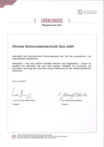 Ahrens nimmt an der Normung für Abgassysteme (Komitee 187) teil und gestaltet diese als Spezialist für Rauchfangsanierung und Neubausysteme aktiv mit.