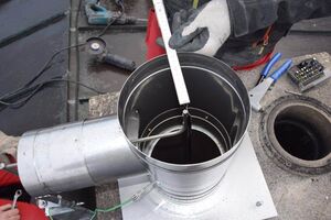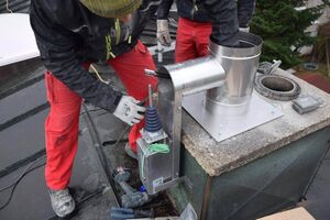 Die Montage des Systems von AHRENS an der Mündung ist wesentlich einfacher – man setzt den Abgasscheider auf und fertig. Einzig der Stromanschluss muss bis auf das Dach gewährleistet sein.