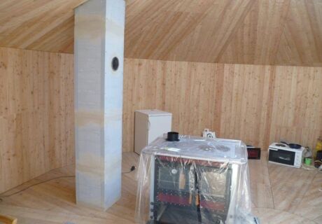 In dem Projekt in Pernitz gibt es einen großen zentralen Raum, der alles in sich vereint: Wohnzimmer, Küche, Essbereich und Schlafraum. Für die Wärmebereitstellung und das Kochen wurde ein Küchenherd ausgewählt, der an einen AHRENS F-90 Leichtbaukamin mit ca. 3,5 Metern Höhe angeschlossen wurde. In diesem System erfolgt ein Übergang von einem einwandigen isolierten Edelstahlrohr zu einem Doppelwandkamin über der Abdeckplatte. Die Abdeckung am Dach erfolgt mittels abgekanteter, schwarzer Edelstahlabdeckplatte und der Rauchfang wird mit dem doppelwandigen Edelstahlkamin AHRENS Kompakt prime mit ca. 2 m Höhe verlängert. Ebenfalls in schwarz gehalten verbindet sich alles zu einem Element, das die Jurte harmonisch abschließt.