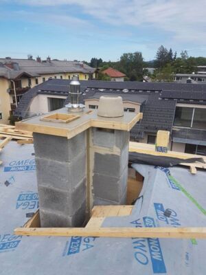 Ein interessantes Projekt in Sachen Neubaukamin wurde im Salzburger Land, und zwar in der Gemeinde Grödig, umgesetzt. Dort wurde ein bestehendes Wohnhaus baulich aufgestockt, bereits vorhanden waren je ein Kamin für die Gas-Zentralheizung und ein Kamin für einen Kachelofen.