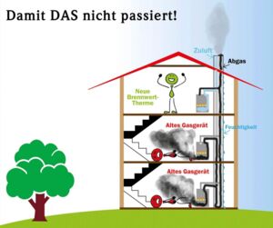 Neue Gas-Brennwertthermen erfordern einen Umbau des bestehenden Abgas-Sammelsystems, weil sie unerwünschtes Kondensat im Abgassystem verursachen und dieses zu Schäden an der Bausubstanz führt wie z. B. nasse Flecken an den Wohnungswänden. Doch das ist nicht das größte Problem! Der wirklich gefährliche Aspekt an der Kombination von alten Abgassammlern und neuen Gas-Brennwertgeräten ist die Tatsache, dass Brennwertgeräte die Abgase mit Überdruck abführen. Die bestehende Abgasführung ist jedoch für Unterdruckbetrieb ausgelegt. Dadurch besteht die Gefahr, dass Abgase in andere Wohnungen austreten und eine direkte Lebensgefahr für die Bewohner besteht.