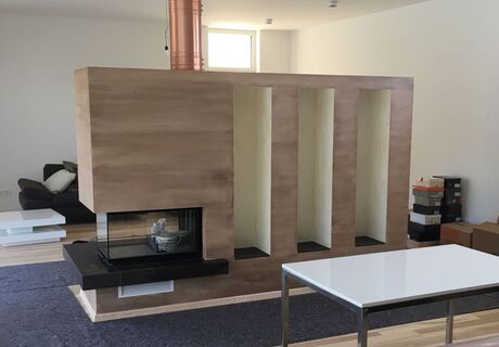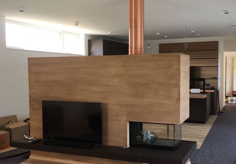 Eine Spezialanfertigung für einen Heizkamin in einer Wohnküche – diese außergewöhnliche Aufgabe hatte Josef Hödl ebenfalls in Wildon mit seinem Technikerteam zu planen und in Folge umzusetzen. Der Hausbesitzer wollte in seiner Wohnküche auf seinen Heizkamin ein gebürstetes und mit Klarlack lackiertes Kupferrohr aufsetzen. Dieses führt über Dach zum Kaminabschluss, der von AHRENS aus einem glänzenden Edelstahlkamin mit Abzugshaube hergestellt wurde. Eine optisch besonders edle Variante, die bei AHRENS gerne auf Anfrage als Sonderausführung umgesetzt wird.