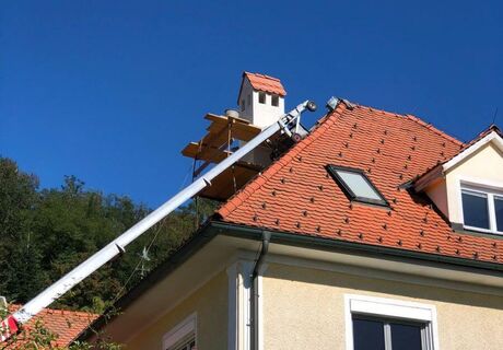 Dringenden Handlungsbedarf sah auch Josef Hödl, der Außendiensttechniker für Sanierung bei einem Objekt in Wildon. Josef Hödl, der für die Süd-Ost-Steiermark und das südliche Burgenland zuständig ist, traf sich direkt vor Ort mit dem Besitzer des Einfamilienhauses und besprach die weitere Vorgehensweise zu dem desolaten und einsturzgefährdeten Schliefer Kaminkopf. Das Techniker-Team von AHRENS stand kurz darauf bereit, und sodann wurde der Rauchfangkopf bis zum Dach hin aufgemauert und verputzt und abgetragen und mit einem Mündungshäuschen samt Biberschwanzeindeckung versehen.