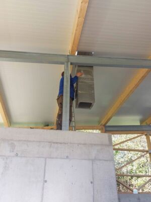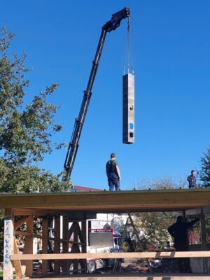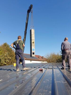 Besonders hervorzuheben bei diesem System ist die schnelle und unkomplizierte Installation. Dank des vor Ort bereitgestellten Krans konnte der vormontierte Fertigkamin mit einer Höhe von 7 Metern rasch und sauber eingebaut werden. Nicht einmal eine Stunde hat der Einbau gedauert. Die innovative Technologie der geschoßhohen Fertigteile sorgt dabei nicht nur für eine statisch sichere und schadstoffarme Lösung, sondern ist auch passivhaustauglich und wohngesundheitsgeprüft.