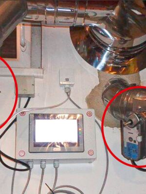 Die Klappe wird über eine Steuereinheit geregelt, welche Daten der in Volllast, als auch bei teilweisem Betrieb und Teillast, Unterdruckmessung (im Bild links eingekreist) im Kamin erhält und sich somit auf alle Gegebenheiten und Betriebsarten einstellt. Der Betrieb der Feuerstätten, sowie die vom Hersteller geforderten Vorgaben, können somit erfüllt und sichergestellt werden. Dabei schont diese automatisierte Lösung auch noch die Umwelt und senkt die Heizkosten – denn durch eine automatisierte Druckregelung für optimalen Zug wird das Heizmaterial effizient genutzt.