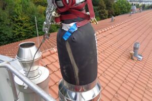 Johannes Wenzl (im Bild), zuständiger Außendiensttechniker für Sanierung in der Stadt Graz und Umgebung wurde vom Volkshilfe Seniorenzentrum Graz-Wetzelsdorf um seine Expertise gebeten, da die Gasheizung erneuert werden sollte. Eine Wirtschaftlichkeitsrechnung hatte bestätigt, dass eine Erneuerung die beste Lösung für das Unternehmen ist. Bei der Besichtigung vor Ort wurde die gewünschte neue Gasheizung besprochen, die mit einer Leistung von 900 Kw einen überdruckdichten und feuchteundurchlässigen Kamin erfordert. Und genau hier lag das „kleine“ Problem. Der Bestandskamin, den Johannes Wenzl vorfand, war für diese Anforderungen nicht geeignet, da es sich dabei um einen doppelwandigen Edelstahlkamin für Unterdruckbetrieb handelte. Zudem machten die Maße des Kamins - Gesamtlänge 20 m, Querschnitt 250 mm und ein 10 m tiefer Verlauf in einem Schacht - eine Demontage schwer möglich und auch ein Verkleinern des Querschnitts war nicht machbar. Die perfekte Lösung hatte Wenzl mit der Sanierungsmethode AHRENSFLEX parat. Denn flexibel wie kein Zweiter, passt sich der für diese Maßnahme spezielle Reliner jeder Renovierungssituation an. Die geometrische Form und der Querschnitt des Sanierungsreliners können dabei innerhalb eines einzigen Schachtes mehrfach verändert werden. Das mit Glasfasern verstärkte Rohr ist zudem korrosionsbeständig und reißfest. Der AHRENSFLEX wurde in den bestehenden Edelstahlkamin eingebaut. Dieser erfüllt mind. alle Anforderungen für eine überdruckdichte, feuchteunempfindliche Brennwertabgasleitung