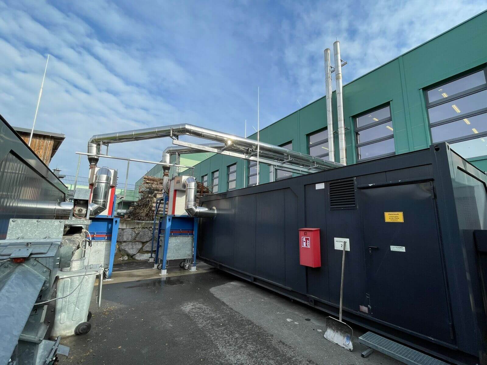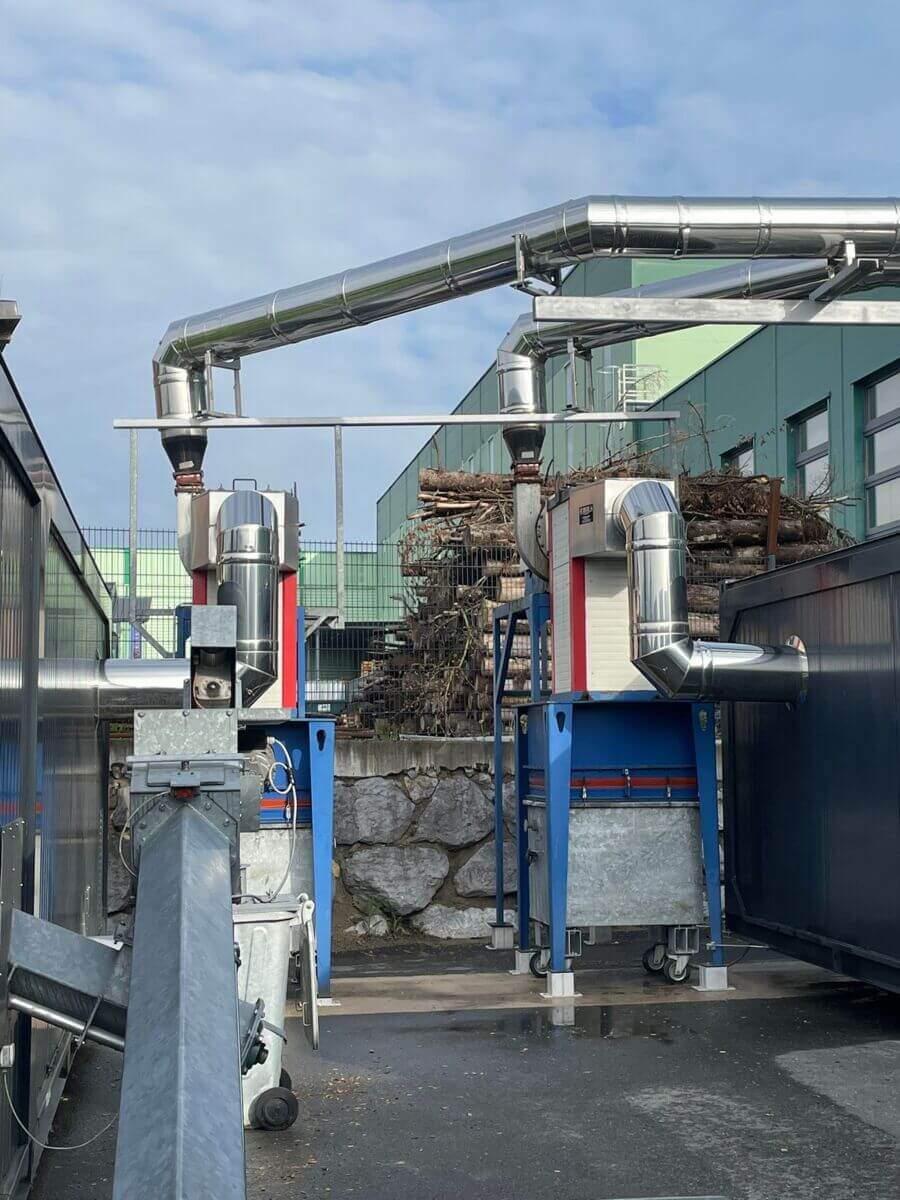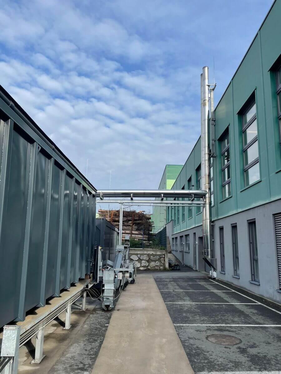 Die beiden bestehenden Edelstahlkamine mit einer Höhe von jeweils 13 Metern und einer Zuleitungslänge von je 14 Metern stellten eine groß dimensionierte Anlage dar, deren Versetzung eine präzise Planung erforderte. Die Umplatzierung der beiden Heizcontainer erfolgte in Zusammenarbeit mit der Firma Enercont aus Kuchl. Nach dem Abbau wurden sie an einem neuen Standort wiedererrichtet. Die Zuleitungen wurden im Anschluss durch AHRENS in der Höhe ergänzt. Mit einer Heizleistung von jeweils 500 kW sind die verbauten Heizomat-Hackgutkessel optimal auf die betrieblichen Anforderungen abgestimmt.
