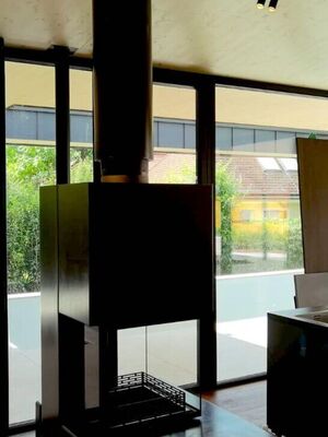 Das gesamte System ist harmonisch in Schwarz vom Wohnraum bis außen über Dach einheitlich gestaltet und passend zum modernen Ofen gewählt.