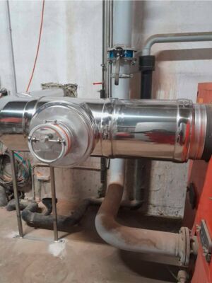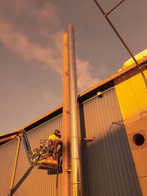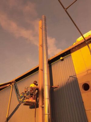 Nun sorgt der 14m hohe Edelstahl-Kamin für die optimale Abgasleitung in der großen Betriebsanlage – glänzend, sauber und sicher zeigt sich dieses Kaminsystem von AHRENS.