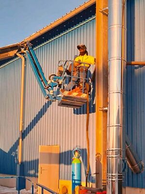 Bei der Betriebshalle der Fa. Katzlberger zeigte sich, dass der bestehende Kamin für die genutzte Heizung zu klein ist und dieser getauscht werden muss. Für diese Aufgabe wurde AHRENS als Experte für Kaminsanierung und -neubau beauftragt. Unter der Leitung von Alexander Cernik, Außendiensttechniker für Kaminneubau von der Betriebsstätte Hallein, kümmerte sich ein fachkundiges Team von AHRENS um eine neue Abgasanlage für die Fa. Katzlberger in luftiger Höhe. Dabei wurde zuerst der alte, bestehende DN 300 Kamin abmontiert. Für die Heizung, ein Ölkessel von Hoval mit 1459 kW, der auch die Heizspitzen der Gemeinde Mettmach übernimmt, erwies sich ein AHRENS Kompakt opti als ideale Lösung in Sachen Kamin. Der gewählte AHRENS Kompakt opti wurde in der Dimensionierung DN 500 mm mit einer Gesamthöhe von 14 m, sowie einer Zuleitung von 3 m Länge mit DN 350 mm verbaut. Bauseits wurde ein Kragarm errichtet: An den installierten I-Träger (300 mm) wurde der Kamin zur Sicherung angeschraubt.