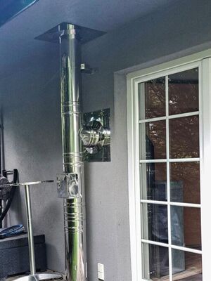 Um für mehr Unabhängigkeit beim Heizen zu sorgen, möchten die Eigentümer einen Einzelofen betreiben können und wendeten sich für den Kamin an AHRENS. Als optimale Lösung für das Projekt wurde der AHRENS Kompakt prime in der Ausführung DN 150 ausgewählt. Das Team von AHRENS montierte den hochwertige Edelstahlkamin mit einem Dachdurchbruch sowie einem Bogen um das Dachelement. Ein Mündungselement und ein Regendachl ergänzen den neuen Kamin, zum Schutz vor Wetter und Witterungseinflüssen. Für Sicherheit bei der Installation im unteren Bereich des AHRENS Kompakt Prime sorgt eine Teleskopstütze, die Wandhalterung wurde Dachseitig mit einer 2-Punkt-Abspannung umgesetzt. Zur Brandsicherheit und zum sicheren Betrieb wurde der DWD-Schott mit Abdeckbleche versehen, so entsteht ein optimaler Brandschutzschacht.