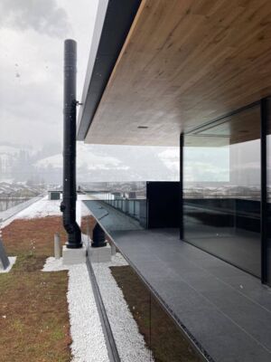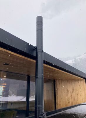 Über Dach wurde die Optik an die Metallverkleidungen in RAL Farbe angepasst. Da das Vordach etwas in den austretenden Kamin einragt, wurde in das System ein Bogen eingesetzt. Ebenso wurde eine Putztür integriert.