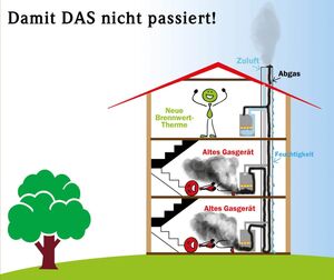 Beim Tausch von Gas-Brennwertthermen entstehen gewisse Risiken, wenn das Abgas-Sammelsystem nicht entsprechend angepasst wird: So können z.B. Kondensatschäden, wie nasse Flecken an den Wänden, auftreten, die nicht nur die Substanz bedrohen, sondern auch langfristig gesundheitsschädigend werden. Im schlimmsten Fall können nicht miteinander kompatible Systeme zu Überdruck und damit Kohlenmonoxid-Austritten in den Geräten und Wohnräumen zu Lebensgefahr der BewohnerInnen führen.