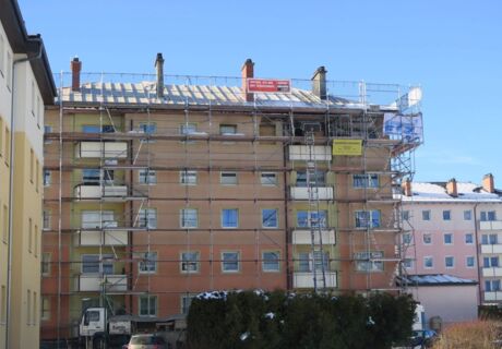 Bei einem Brand in einer Wohnhausanlage mit 20 Parteien in Trieben (Stmk.) brannte die oberste Wohnung völlig aus, und das Feuer griff auf den Dachstuhl über. Somit wurden auch die Kamine beschädigt. Nach Rücksprache mit dem zuständigen Rauchfangkehrer, der Fa. Lammer, wurde die Sanierung von Siegfried Spitzer, dem Außendiensttechniker Sanierung für die Obersteiermark und Kärnten, geplant. Vom Dach aus wurden in der Folge auf der rechten Seite des Hauses die schadhaften Polypropylenrohre ausgebaut und die Kamine neu mit Ahrenit Spezialmörtel abgedichtet. 2 Kaminköpfe werden noch abgetragen und mit Klinker-Ziegelsteinen neu aufgemauert und mit einem Edelstahldach versehen.