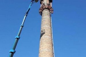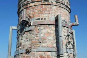Im oberen Bereich waren Fugen ausgebrochen und ein rund 2 Meter breiter Bereich des verwitterten Schlots musste dringend saniert werden. Diese Sanierungsarbeiten waren jedoch nur mit einem Kran bzw. Hubsteiger möglich und dies bereitete dem Sanierungsexperten Racher kurzfristiges Kopfzerbrechen - was aber nicht an den Arbeiten am Schlot lag, sondern an der äußerst schmalen und niedrigen Einfahrt in das Firmengelände. Doch auch hier gelang es gemeinsam mit einem langjährigen Partner von AHRENS eine Lösung zu finden.