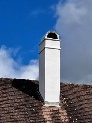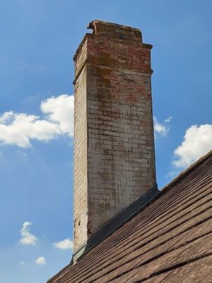 Beim kleineren Nebengebäude wurde ebenso der Kaminkopf, als auch der Innenbereich saniert. Auch hier wurde der alte, schadhafte Putz abgeschlagen und der Kaminkopf mit Kalkputz frisch verputzt und für die authentische Optik wieder weiß gestrichen. Für das Innenleben wurden, wie auch beim Schlieferkamin, starre Edelstahlrohre eingezogen. Der kleinere Kamin wird für einen Küchenherd genutzt.