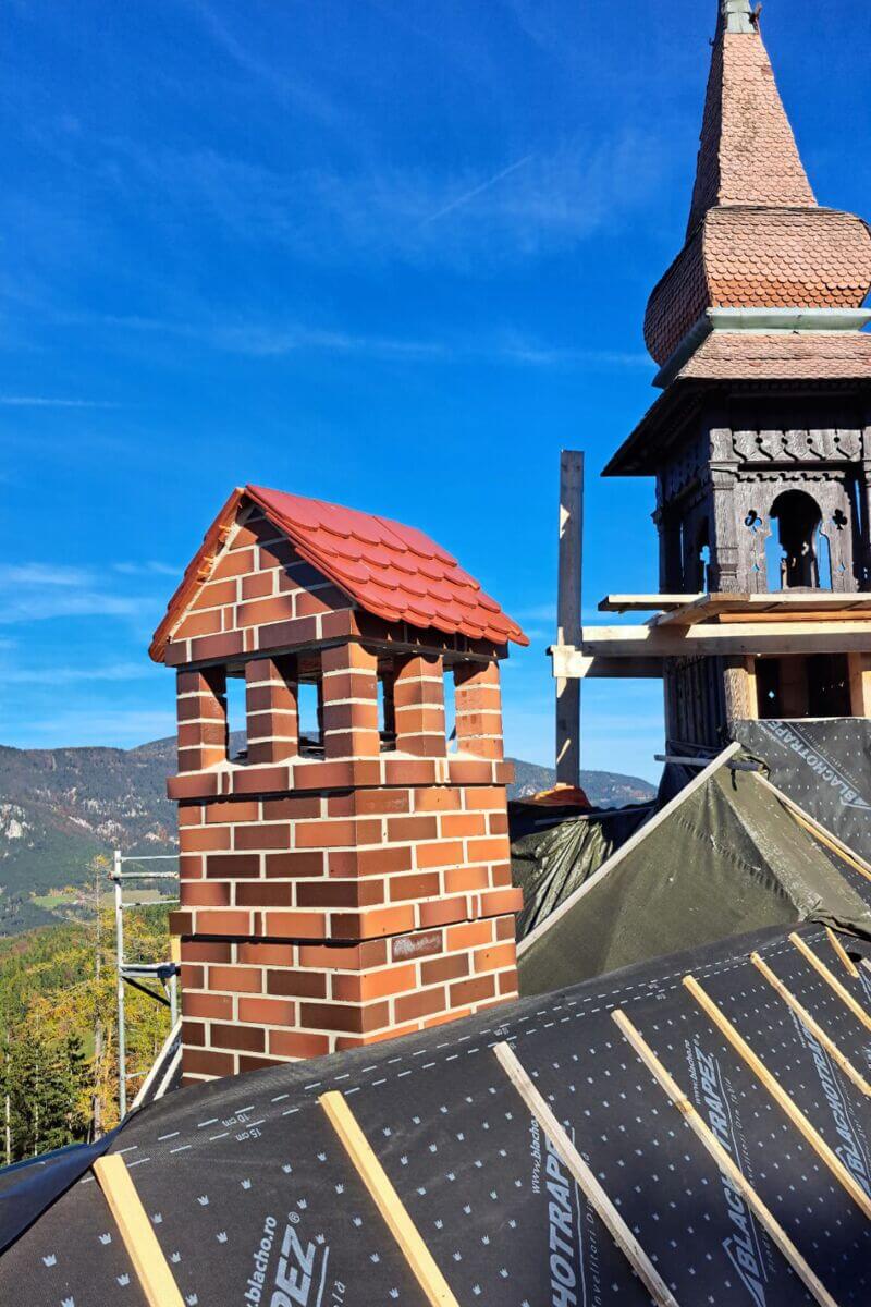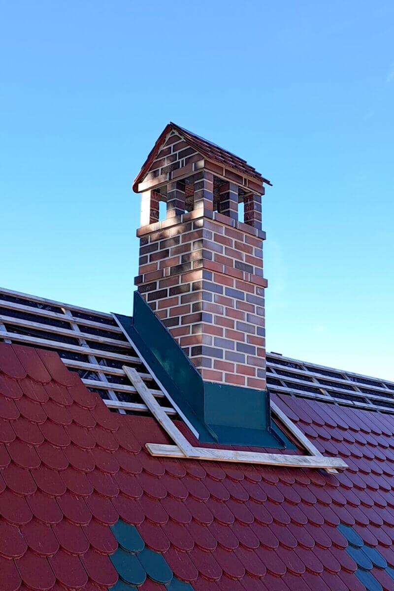 Ein Team hochqualifizierter Facharbeiter unter der Leitung von Lukas Hintersteiner, Außendiensttechniker für Kaminsanierung an der Betriebsstätte Achau, wurde mit der Durchführung dieser anspruchsvollen Maßnahme betraut. Durch die fundierte technische Expertise des Teams sowie deren präzises handwerkliches Vorgehen konnten die Kaminköpfe und die dazugehörigen Innenauskleidungen fachgerecht und nachhaltig saniert werden. Im Rahmen des Projekts wurden insgesamt drei Kaminköpfe über Dach sauber abgetragen und danach mit Klinkerziegeln neu aufgemauert. Mehrere Zierscharen verleihen den Kaminköpfen ihren authentischen, alten Charakter. Um den historischen Charme der Villa zu bewahren, wurde das Dach im Rahmen der Sanierung mit einer Biberschwanzdeckung bis zum Kaminkopf neu eingedeckt.