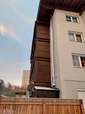 Für die im Erdgeschoß befindliche Wohnung wurde das Kaminsystem AHRENS Kompakt Opti ausgewählt. Der Außenwandkamin aus Edelstahl wurde mit einer Höhe von 13m und der Dimensionierung von 150mm an der Außen-Fassade der Wohnhausanlage befestigt. Bei diesem Projekt wurde der AHRENS Kompakt opti inklusive Konsole, Reinigungselement und T-Anschluss ausgeführt und zusätzlich wurde eine Deckenblende für die benötigte Hinterlüftung installiert. Der schmucke Edelstahlkamin in Hochglanz-Optik wurde bei der Mündung mit einer Regenhaube ergänzt, um vor Witterungseinflüssen zu schützen. Für die Montage in der Wohnhausanlage wurde ein Übergang von einem ein- auf ein doppelwandiges System benötigt, die Spenglerarbeiten erfolgte bauseits.