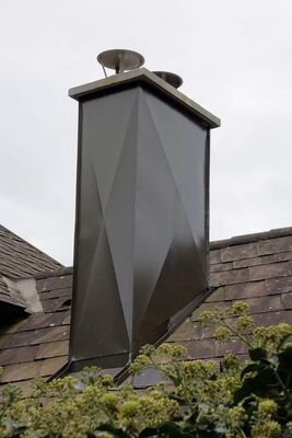 Für die Möglichkeit einer unabhängigen Wärmeversorgung benötigt es eine sichere und technisch ausgereifte Abgasführung. Der bereits bestehende Kamin wurde für die Zentralheizung genutzt, daher musste ein neuer Kamin das Haus integriert werden.