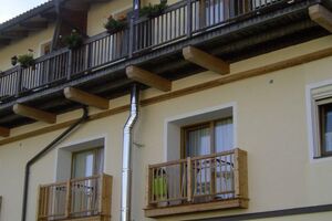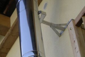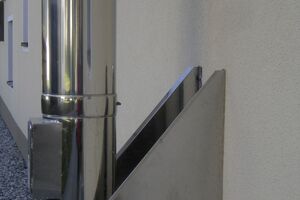 Deswegen entschied sich Willi Handl, das System AHRENS Kompakt, also einen doppelwandigen Edelstahl-Außenwandkamin mit Durchmesser 200 mm, zum Einsatz zu bringen. Dabei wurden 11 m des ausgewählten Kaminsystems verbaut, welches nicht nur alle technischen Voraussetzungen für den Betrieb des Pizzaofens erfüllt, sondern auch für alle Regelfeuerstätten zugelassen ist (Festbrennstoff, Öl, Gas). Als Brandschutz zu brennbaren Bauteilen (Balkon) wurde ein hinterlüfteter Abstand mit 7 cm eingeplant. In der Dachuntersicht wurde eine Deckenblende mit Lüftungsschlitzen eingebaut, damit eine sichere Hinterlüftung gewährleistet ist und die Optik stimmt. Aufgrund der Höhe über Dach wurde der Kamin zusätzlich mit verstellbaren 2-Punkt-Abspannungen abgestützt, und um die Mündung vor Fallwind zu schützen, wurde ein Lamellenaufsatz aus Edelstahl montiert.