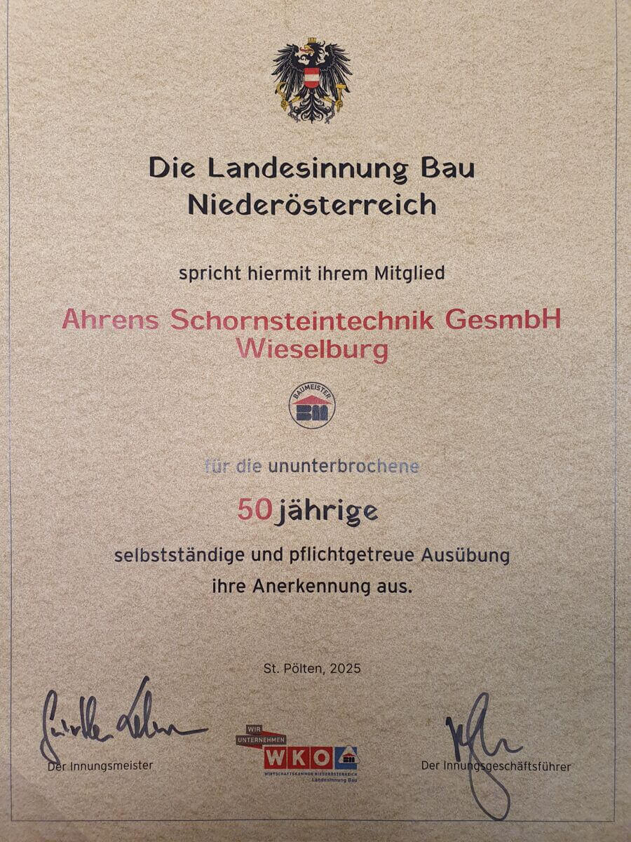 Die Landesinnung Bau Niederösterreich spricht ihrem Mitglied, der Firma Ahrens Schornsteintechnik GesmbH (Baumeistergewerbe), für die ununterbrochene 50-jährige selbständige und pflichtgetreue Ausübung ihre Anerkennung aus.